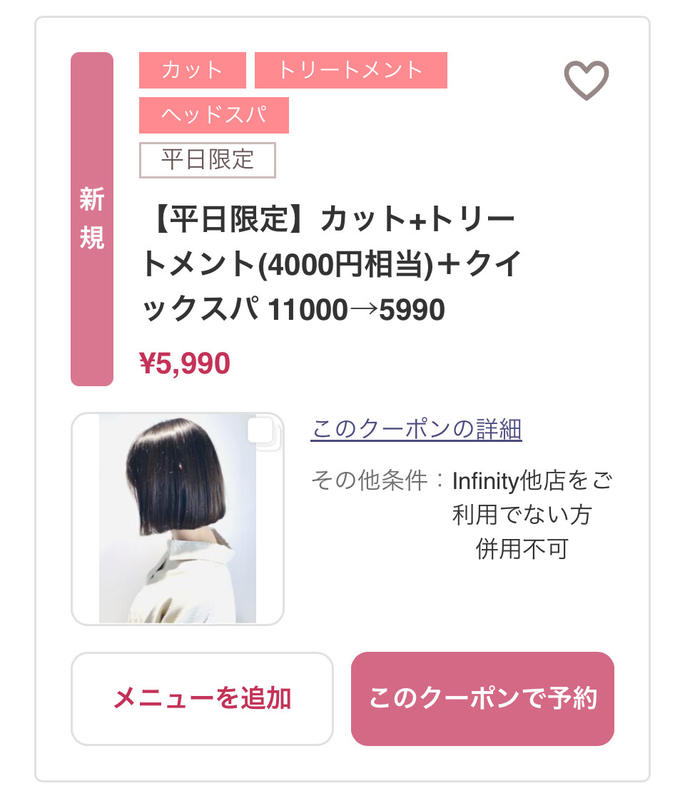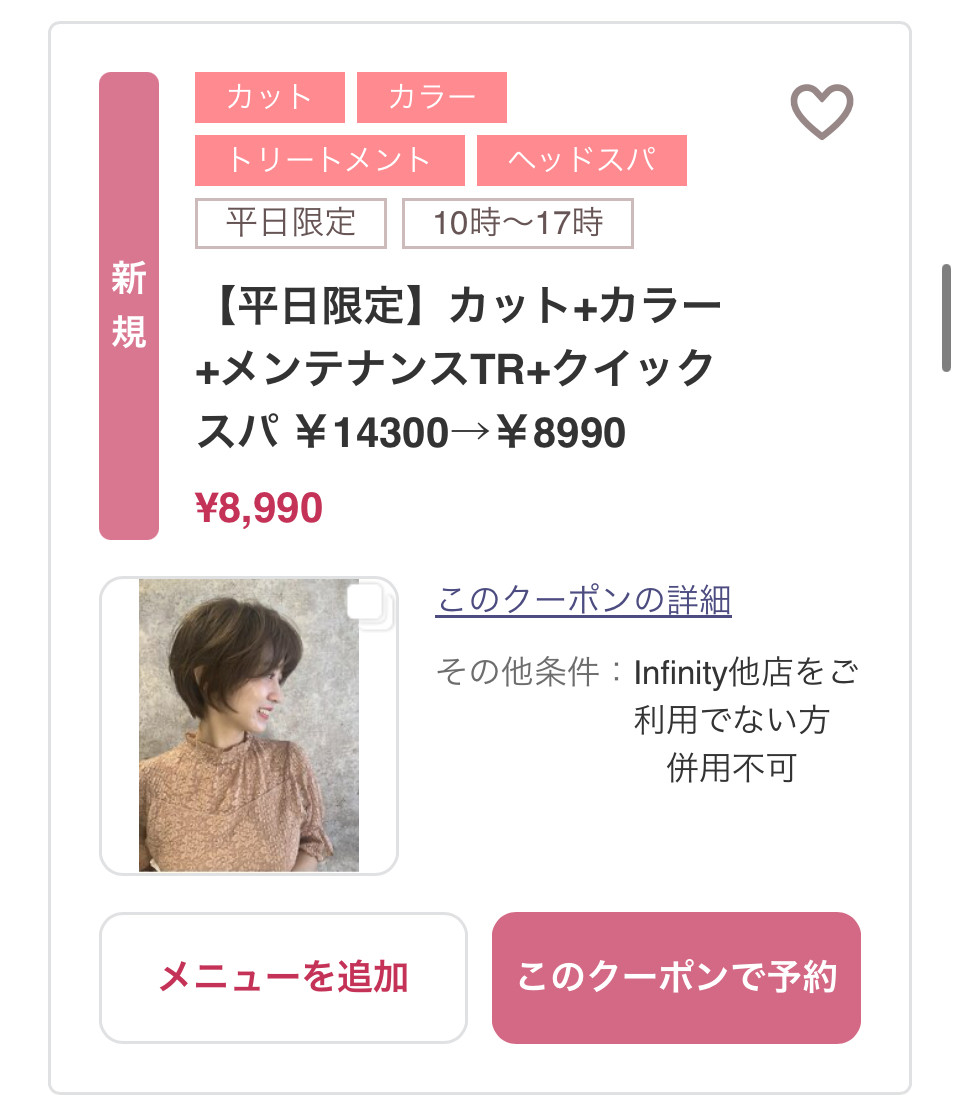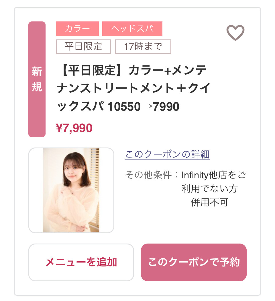 現在Infinityでは、大変多くの方々に人気のある【平日限定】のクーポンをご案内いたします☆