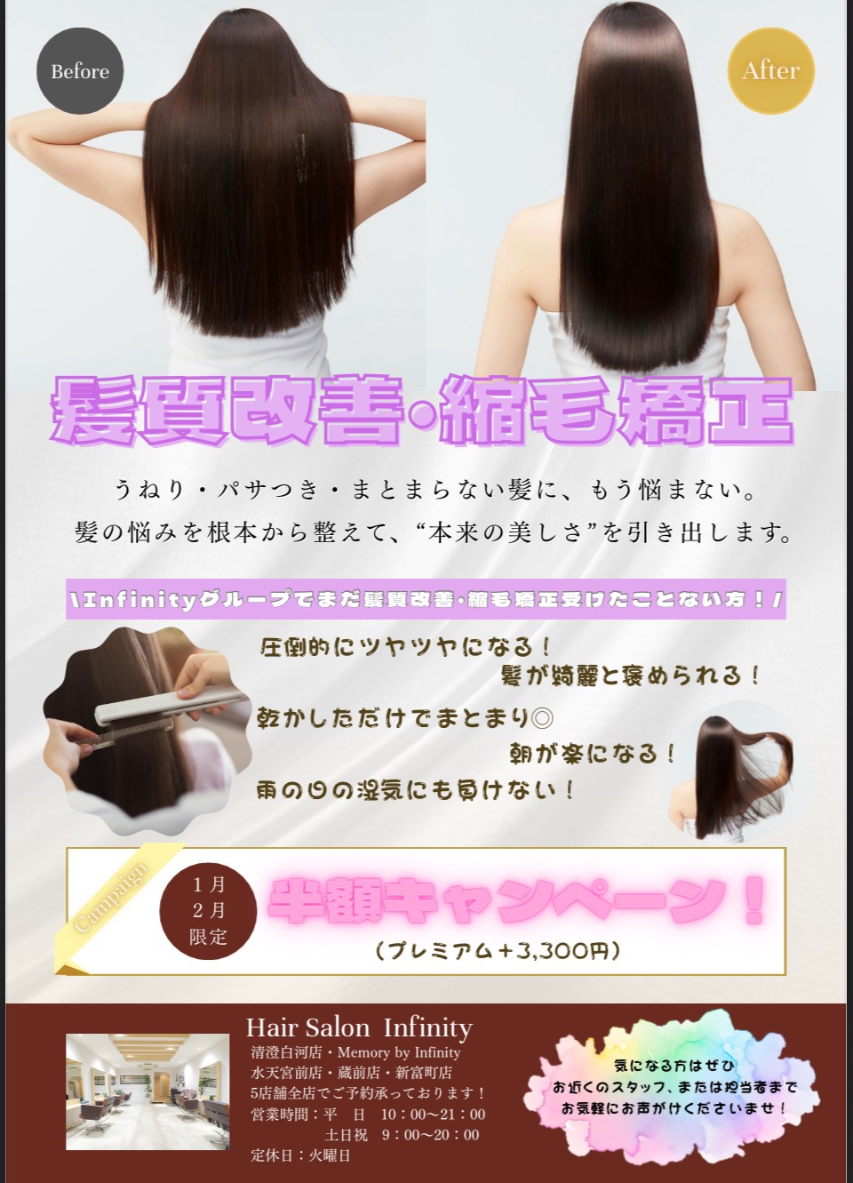 なんと、1月・2月の2ヶ月間限定で、「髪質改善・縮毛矯正」が半額になるスペシャルキャンペーンを開催いたします!